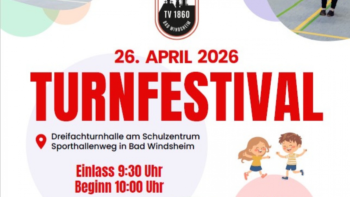 Herzliche Einladung zu unserem diesjährigen Turnfestival am Sonntag, den 26. April ab 10 Uhr! Die Turnabteilung freut sich, Ihnen ein buntes Programm aller Kinder- und Jugengruppen präsentieren zu können. Für das leibliche Wohl ist bestens gesorgt!